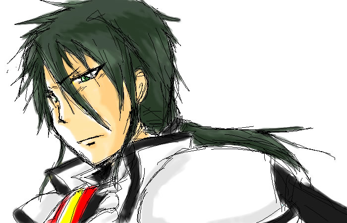 髪の毛は黒ではなく若干緑がかっている。そして眉毛はすごく短い。